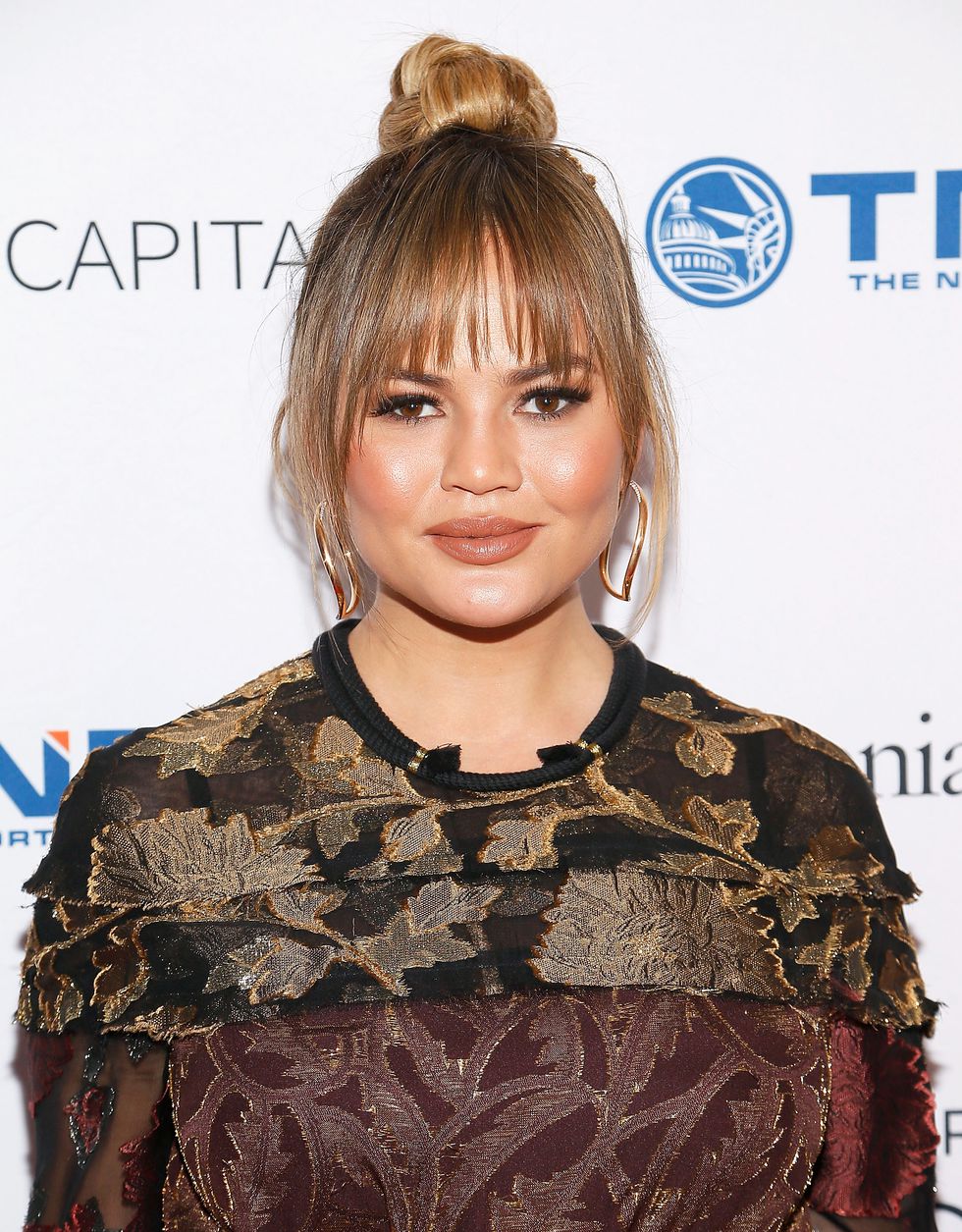 If you’re not ready to commit to bangs, you can easily make new ones by flipping part of your long hair from the back of your head and put the rest up in a knot, just like Chrissy Teigen did. You will need a wide comb and some bobby pins to hold it all together and voila!